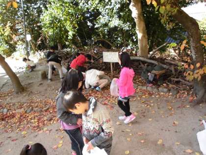 知恩寺に秋見つけに行きました。どんぐり,葉っぱ,松ぼっくりを拾いました。「きれい。」「形がきれい。」と大はしゃぎです。中には,「毎日来たい。」なんて言っている子もいました。拾ったものは,生活科の学習に使います。
