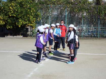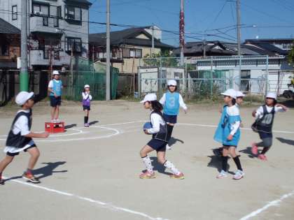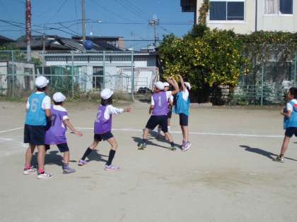 体育の授業は「ポートボール」を学習しています。リーグ戦で競っています。リーグ戦が終わると,次はトーナメント戦で順位を決定していきます。作戦タイムで,勝つための動き方や声のかけ方などを工夫しています。
