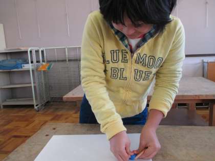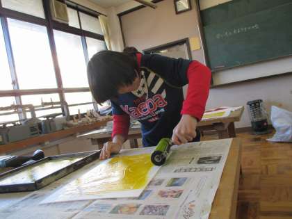 今,えのき学級ではスチレンボードを使った版画に挑戦しています。スチレンボードは発泡スチロールのように柔らかい素材なので,少し押すだけで簡単に凹凸を作ることができます。今日はペットボトルのキャップや割りばし等を使って色々な模様を作りました。みんな刷り上がった作品を見る時は目を輝かせていました