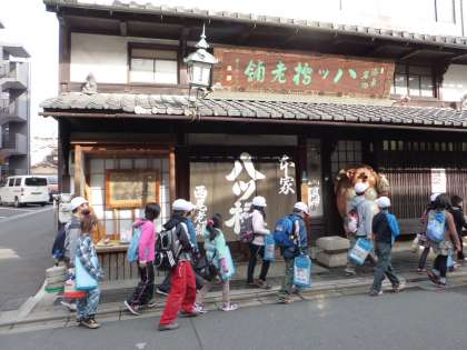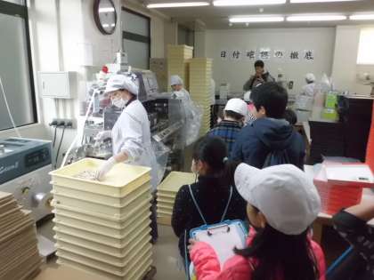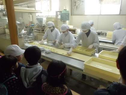 社会の学習で「西尾八ッ橋」さんの工場へ社会見学に行きました。始めに「八つ橋」が商品として出来上がるまでの工程を見学しました。職人さんの手作業の速さに驚いたり,機械の丁寧な動きに感心したりしていました。
