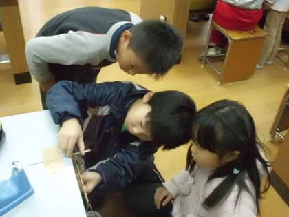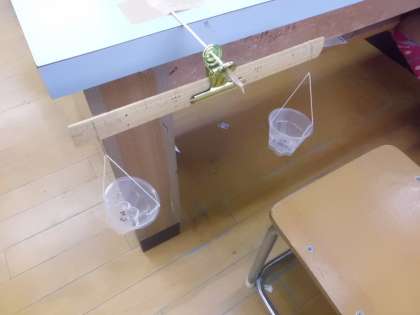 理科で「ものの重さを調べよう」を学習しています。理科室で手作りの簡単な天秤を作り,身の周りにあるもので重さを比べ,どちらが重いかを調べました。今回は,電池と石の重さを比べてみました。子どもたちは,石と比べ,意外に電池が重たいことを知ることができたようでした。