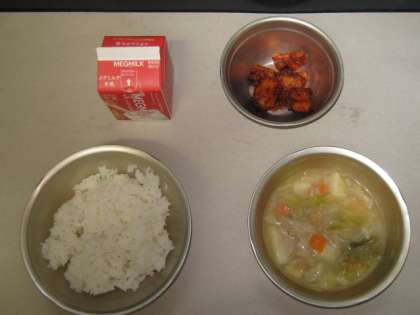 今まではまぐろを使ったアングレスだったのですが,今日はさけを使いました。まぐろに比べてやわらかく仕上がりました。トマトケチャップとウスターソースの甘く,しっかりとした味がごはんによくあいました。スープ煮も野菜がたっぷりで,よく食べていました。