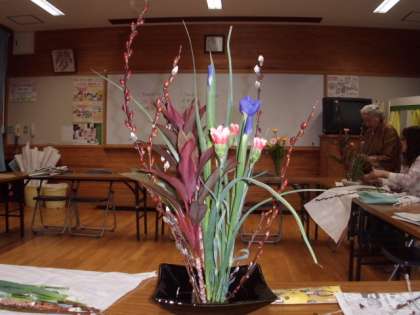 「木から活けていくとよい。」「木は斜めに切る。」何度も教えていただいたことですが,忘れてしまいます。赤芽柳から活け始め,最後も赤芽柳で全体のバランスを整えました。画像1が,先生の作品です。
