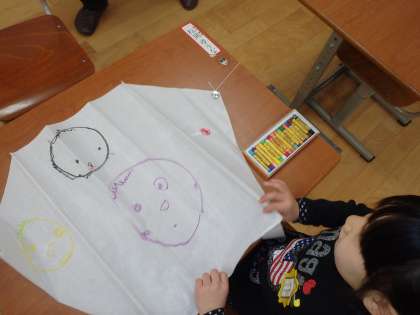 今日はみんなで凧をつくりました。みんなそれぞれ好きなものを描きました。