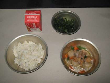 今日の給食は,麦ごはん・牛乳・鶏肉と里いもの煮つけ・ほうれん草とじゃこのいためものでした。里いもがやわらかく,味もしっかりしみこんでいました。ほうれん草とじゃこのいためものは,ごまの風味がよくきいていて,ごはんによくあいました。