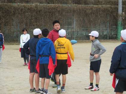 6年生も体育の学習でフラッグフットに入りました。京都大学の学生の方が教えてくださいます。3年生から始めているので、子どもたちも慣れています。ボールの投げ方や受け取り方を確認した後は,すぐに試合に入りました。試合をする前には作戦も立てました。