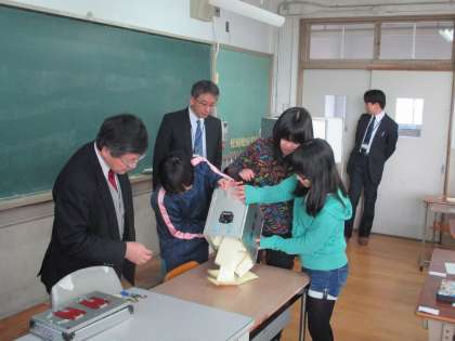 今日は選挙の仕組みを教えていただき,投票所の様子を聞きました。その後は,実際に模擬投票をしました。3人の方の演説を聞き,投票します。1番初めに投票する人は,投票箱に何も入っていないことを確認してサインをするそうです。開票する時は,わくわくしている様子でした。