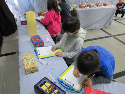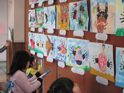 生活科ルームで行われている図工展の作品を鑑賞しました。1年生は,上級生の素敵な作品にびっくりしていました。すごいなと思うところを鑑賞カードに書き込みました。1年生の作品もなかなか素敵です。