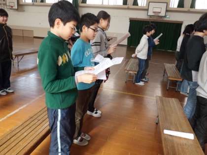 3月から卒業式の練習を始めました。卒業生の言葉の分担を決め,今日からは体育館で言葉の練習をしました。まだ言葉を覚えていないこともあり,自信をもって大きな声を出すことが難しい子もいましたが,それぞれが良い雰囲気の中で練習できました。