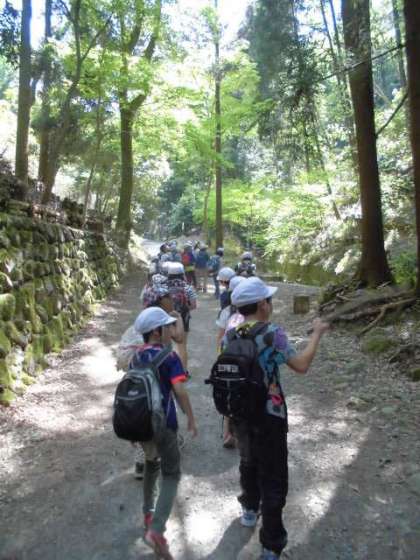 山の中はとても涼しく,「湧水があった。」「木の模様が違う。」「きつつきの商売の森の中みたい。」と色々な自然を見つけながら頂上を目指しました。頂上で食べるお弁当をとても楽しみにしていました。