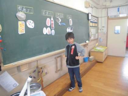 まずは,ごみ捨て場に行く前に,お家でどのように分別しているのか考えました。意外なものが燃えるゴミであるなど,驚きもありました。