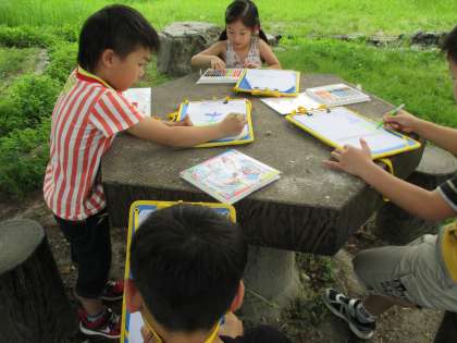 今までの学習でお気に入りの春の植物を見つけていました。今日は,絵を描きにいきました。とてもよいお天気で暑かったですが,ドリームワールドの木陰は涼しくて気持ちよかったです。外で何かをかくことは初めてで,探検ボードとクーピーを持って,お兄さん・お姉さんになった気分で張り切っていました。