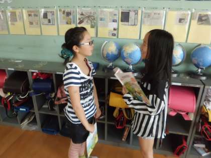 習った表現を使って,早速友だちに尋ねていました。