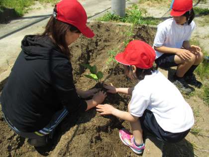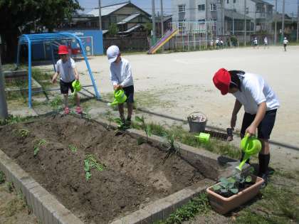 連休が明けていよいよ畑に苗を植えました。子どもたちと育てたい野菜を話し合って植えたものは,トウモロコシ・ミニトマト・ピーマン・ナス・サツマイモです。草抜きをして畑を耕して,畝を作ってと暑い中作業を頑張った子どもたち。それぞれの苗を丁寧に植えられました。これから毎日水やりを頑張って野菜ができるといいなあと思っています。できた野菜で何を作ろうか今から楽しみにしています。