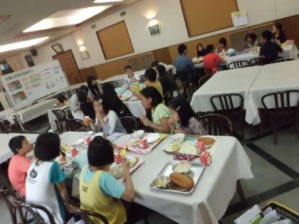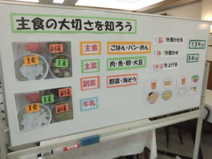 栄養教諭から主食についての話を聞いた後,陶器の食器を使って食事をしました。