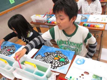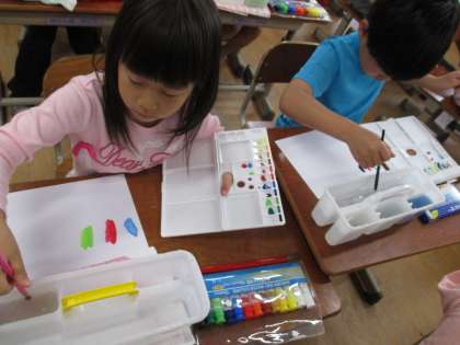 図工の時間に絵の具セットを使って,いろいろな色をつくってみました。まず最初に絵の具をパレットに少しずつ絞り出し,その色を白い試し紙にちょっとずつ塗ってみました。その後,いろいろな色の混ぜ方を試してみました。そしてさいごに「にじいろのさかなをつくろう!」と呼びかけると,みんな大喜びでパレットに作った色を一枚一枚のうろこにていねいに塗っていきました。それぞれの個性が出ていて,教室の後ろに虹色の魚の泳ぐ海ができました。