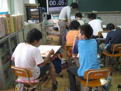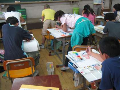 自分の全身の絵を描いています。皮膚の色に気を付けながら,色を置くようにつけました。また,服には絵の具で色をつける代わりに,布を切って張り付けた子もいます。腰を上げて熱心に取り組んでいました。