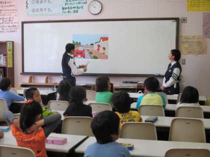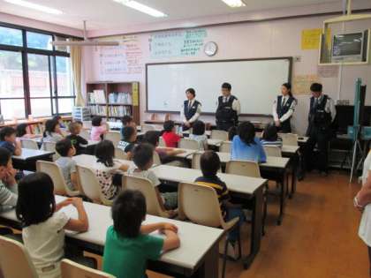 えのき学級,1・2年生を対象に,交通安全教室を行いました。道路の安全な歩き方について,視聴覚室でお話を聴いた後,実際に校区へ出て歩き方の練習をしました。