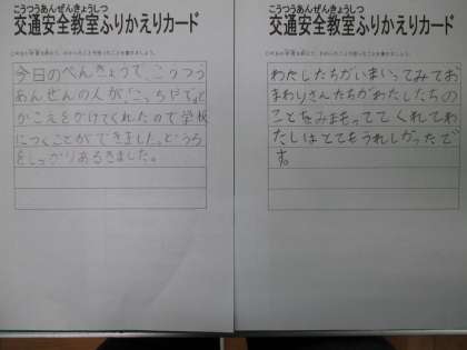 下鴨署の交通課の方々や,鴨大橋の交番のおまわりさん,地域やPTAの方々に見守ってもらい,学校の近くをぐるりと1周歩きました。教えていただいた「左右を見ることの大切さ」や「歩く場所」に気を付けて,班の仲間と声を掛け合いながら行きました。普段の登下校や遊びに行くときなどに生かしてほしいです。