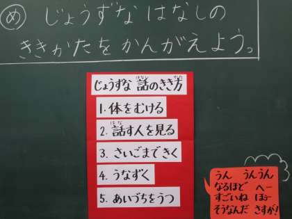 道徳の時間に今年初めての「ハートフルタイム」の学習をしました。今日のテーマは「上手な話の聞き方を考えよう」でした。子どもたちは,「話を聞いてもらえないといやな気持ちになる。」「話を聞いていないと後で大変だった。」など今までの経験を話し合い,上手に話を聞くために大切な事を見つけていきました。相手の顔を見て話を聞くだけでなく,「うんうん」「ふーん」「そうなんだ」という相槌を打つことで気持ちよく話せることにも気づきました。