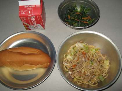 今日の給食は,小型コッペパン・牛乳・ソース焼きそば・ほうれん草のいためナムル