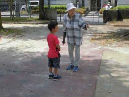 昨日のインタビューの練習をもとに,いよいよ飛鳥井公園に来ました。いつも遊んでいる公園なのに,インタビューするとなると少しドキドキと緊張しているようでした。