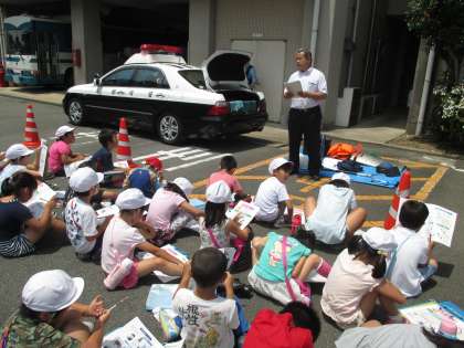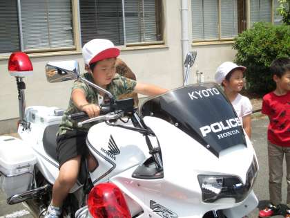 生活科の「町たんけん」の学習で,下鴨警察署へ見学に行きました。「警察署の前は通るけど…中はどうなっているのかな?」子どもたちは興味津々でした。パトカーや白バイ,警察官の使う道具などを体験させてもらって,大喜びの子どもたちでした。子どもたちの質問にも丁寧に答えていただき,わたしたちのくらしを守っていただいていることを身近に感じることができました。