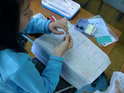 今日は、家庭科の学習がありました。玉結び,玉どめの練習をして「なみぬい」に挑戦しました。やっと針穴に通した糸がすぐ抜けてしまったり,糸をねじったつもりでも,玉結びになってくれなかったり,とても難しかったです。上手にできるようになったら,次はナップサック作りに挑戦します!