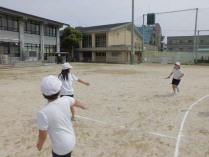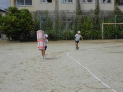 第一レースでは,みんなの応援が激しく、どちらも全力を出して走っていました。第二レースは,なんどバトンが巨大化してのレースです。途中に先生が立っていてじゃんけんに負けると巨大バトンでレースをします。みんな大盛り上がりでした。