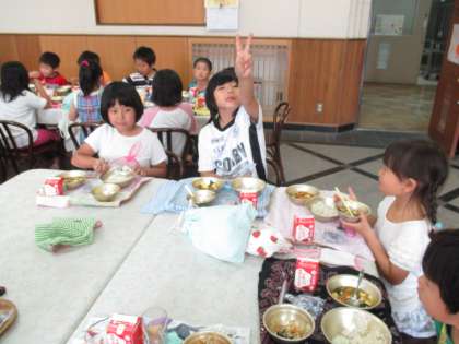 今日はランチルームでえのき学級のお友だちと一緒に交流給食をしました。献立紹介やあいさつも今日の日直が一緒にとても元気よくできていました。子どもたちはいつもランチルームでの給食を楽しみにしています。今日はえのき学級のお友だちと一緒なので一段と楽しく賑やかに食べていました。カレーどうふは和風な味でとってもおいしく,みんなぱくぱく食べました。