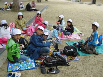 1・2年生は14日(金)に,子どもの楽園へ遠足に行ってきました。1年生は2年生のお兄さんお姉さんとペアになって活動しました。少し,雨が降って残念だったけど,2年生のお姉さんたちと色々なお話をしながら歩いたり,お弁当を食べたりしたのがとても楽しかったです。平安騎馬隊の馬を近くで見ました。