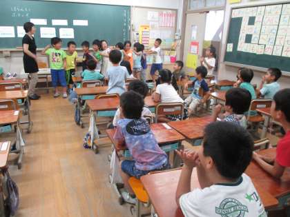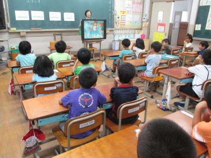 7月の人権学活は,韓国朝鮮の文化を知ることがテーマです。今日はみんぞく教室の崔先生が学活の時間に来てくださいました。まずは韓国語でのあいさつの言い方を教えてもらいました。お礼の言い方は知っている子が多く,みんなどんどん覚えていました。そして,「ふえふきトルセ」という昔話を読んでもらいました。韓国の昔話にはトラが出てくるお話が多いそうです。このお話もトラが出てきました。絵本の中に出てきたトラの踊りを教えてもらい,みんなで踊りました。最初は恥ずかしそうにしていた子も,前に出てくると,とても楽しそうに踊っていました。日本の昔話にも似たようなお話があり,共通点を見つけられました。