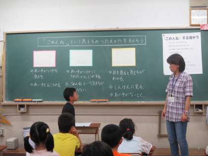 学活の時間に「ごめんね」の言い方について学習しました。ごめんねと言う言葉は,身近な言葉で子ども達もよく使いますが,その言い方によって,相手を怒らせてしまったり相手にいやな気持ちを与えてしまったりすることがあるんだということを,実際にペアで試してみて実感することができました。
