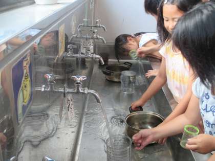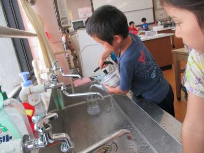 最初,「『かさ』って雨の日使うもの?」と言っていた子ども達ですが,「水の量を量るから家庭科室で算数をするよ」というと「え〜家庭科室に入れるよ。やったー!」とやる気満々で,いろいろな入れ物の水の量を量っていました。L(リットル)やdL(デシリットル)を実際に量ることで体感することができました。