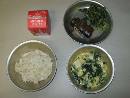 今日の給食は,玄米ごはん・牛乳・さんまのかわり煮・だいこん葉のごまいため・かきたま汁でした。今日は,今年1年間で6回でてくる玄米ごはんの1回目でした。