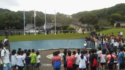 2日目の朝を迎えました。元気いっぱいの子どもたちです。朝の集いをおこない学校紹介もしっかり行えました。お天気は子どもたちに味方をしてくれ,晴れ間が見えています。今日は裏山ラリー,磯観察,プール,キャンプファイヤーと盛りだくさんです。