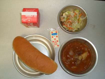 今日の給食は,ミルクコッペパン・牛乳・トマトシチュー・大豆とキャベツのソティでした。トマトシチューは,夏用に少しさっぱりとしたシチューになっています。