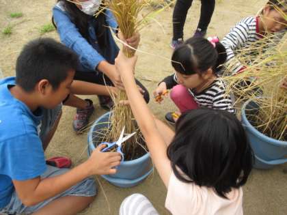 5年生と一緒に育てていた稲が実り稲刈りをしました。5年生に手伝ってもらいながら稲穂を持つ係や切る係になり稲刈りができました。ひもでしばってまとめ,今,干しているところです。次は脱穀,もみすりです。お米がとれたら5年生と一緒に「お米パーティー」をする予定です。さあ,何を作って食べようかな?