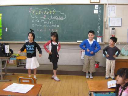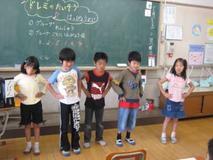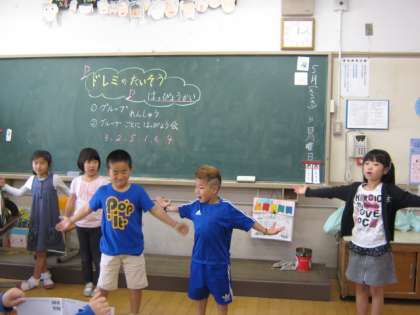 音楽の学習で『ドレミたいそう』の発表をしました。ド・レ・ミ・ファ・ソ・ラ・シ・ドの階名にはそれぞれの身ぶりがあります。その身ぶりを『ドレミのうた』にあわせて発表しました。初めての発表会だったので,少し不安でしたがみんなとても上手に発表をすることができました。次回は歌いながら発表できるように練習をします。