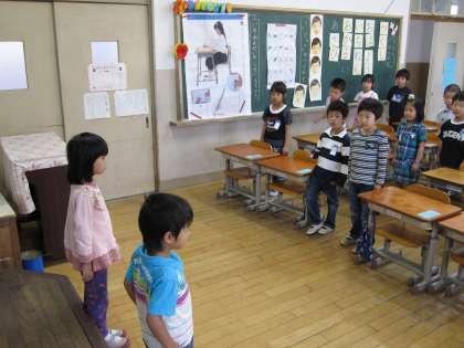 毎日クラスでは,当番のお仕事があります。その中のひとつ日直は毎日,順番に回ってくるお仕事です。主な仕事の内容は朝の会と帰りの会の司会です。少しずつみんなに届く声でお話ができるようになってきました。