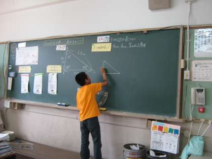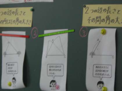 三つの方法で合同な三角形を書き方を考えています。これまで,コンパスや分度器を使って書く方法を学習しています。それらの方法を利用して,角の大きさや辺の長さなどの条件が限られた中で三角形を書きます。