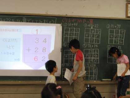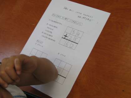 今日は初めて『ひっさん』の学習をしました。繰り上がりのある計算でも簡単できるすぐれた計算方法です。今日はひっさんのきまりを知り練習しました。まず1,くらいをそろえる 2,一のくらいを計算する。繰り上がりがある場合書く。3,十の位を計算する でした。とくに繰り上がりを忘れないことを学びました。練習問題を一生懸命取り組んでいました。