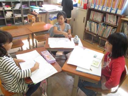 今,国語では,アーノルド=ローベルの「お手紙」という物語を学習しています。がまくんとかえるくんの心温まるお話です。この物語は会話文が中心なので,すきな場面の音読劇の発表をして,物語の主人公の気持ちにせまりたいと思っています。この日は,そのグループに分かれて,グループごとに台本を読み合わせました。どんな読み方をしたらいいか,どんな動きをしたらいいかなどこれから話し合っていきます。友だちの読み方のよいところを取り入れて,気持ちのこもった音読劇にしてほしいです。