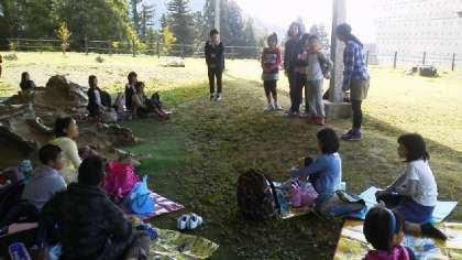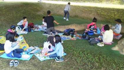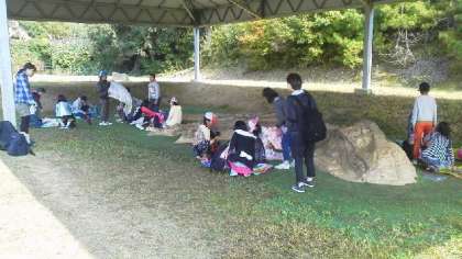 予定通り11時30分ごろ恐竜博物館に到着しました。バス酔いする子どものなく,みんな元気です。お家から持ってきたお弁当を良いお天気のもと,おいしく食べました。お弁当の味は,いつもよりおいしく感じたのではないでしょうか。