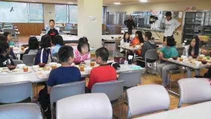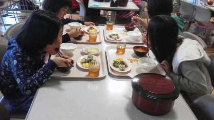 元気に目覚めた子どもたち。良い天気に恵まれ,今日は絶好の登山日和です。山登りに備え,しっかりと朝食をいただきました。