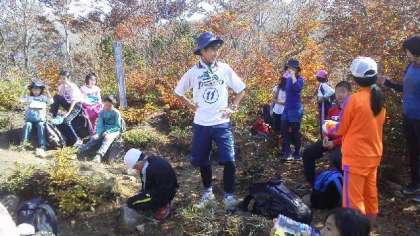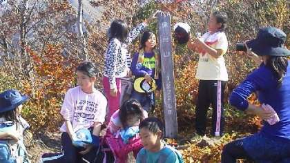 保月山の頂上で休憩しています。釈氏ヶ岳をめざします。頑張っている子どもたちです。昼食まであと少し。