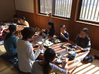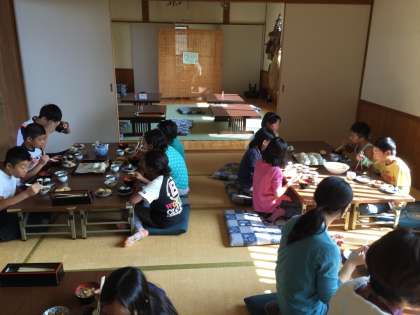 自分たちで作ったいもぼたとおにぎり,そして郷土料理ののっぺい汁で昼食です。自分たちで作ったものは本当に美味しいですね。のっぺい汁も喜んで食べていました。