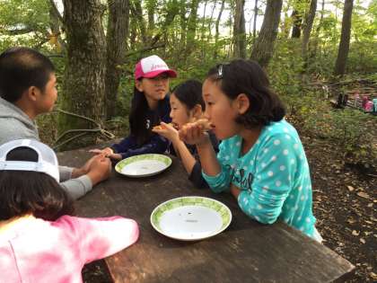 森遊びを楽しんだ後は,ピザ作りです。生地から作り,とても美味しいピザができ上がりました。森の新鮮な空気を吸いながら,美味しくいただきました。