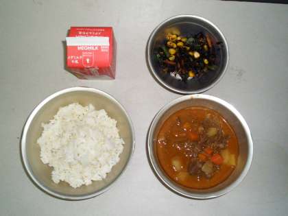 今日の給食は,麦ごはん・牛乳・カレー・ひじきのソティでした。