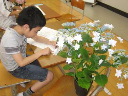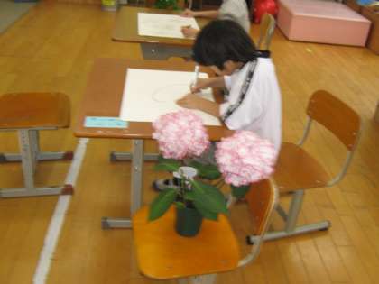 6月といえばあじさいの季節ですね。街角にも花屋さんにもあじさいがいっぱいさいています。教室にもあじさいがやってきました。それをくわしく観察しながらすてきなあじさいの絵を描きました。